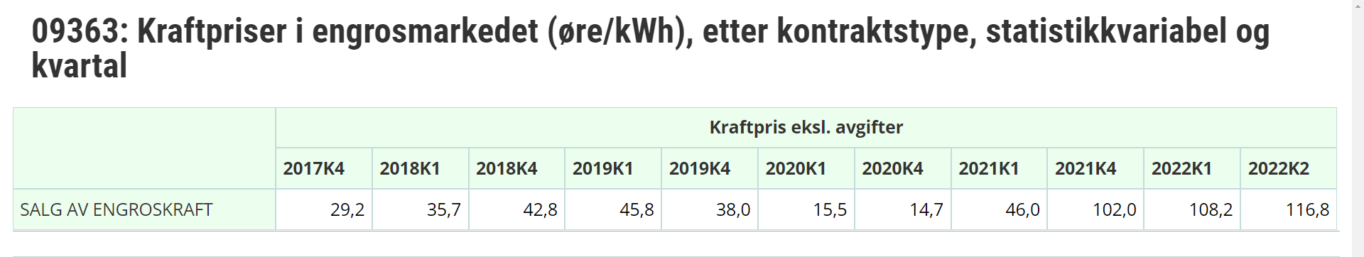 A-hunter Skrevet 19. august 2022 #14 Skrevet 19. august 2022 Frysepinne skrev (17 timer siden): Det er jo ikke bare det at den er enkel, den er jo direkte misvisende På bildet under ser du hvorfor Giske har rett, mens Hauglie tar feil (eller lyver). Nordlink åpnet 27.3.21, North Sea Link åpnet 1.10.21 mens Russland invaderte Ukraina 24.2.22 (utenfor bildet). Utslagene av krigen ser man av utklippet fra SSBs tabell 09363 her; Omtrent ingenting... 3 1