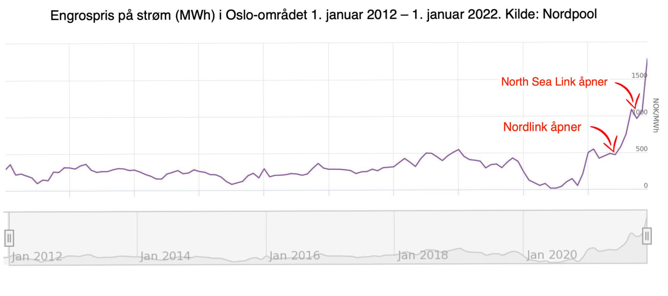 Caniggia Skrevet 18. august 2022 #12 Skrevet 18. august 2022 Frysepinne skrev (36 minutter siden): Jeg har alvorlig problemer med å skjønne at voksne, oppegående folk juger til meg, så når Anniken Hauglie sier at det er krigen i Ukraina og gasslevereringer fra Russland som er hovedårsaken til de høye strømprisen, ønsker jeg å tro henne. Men samtidig vet jeg jo at strømprisene økte mye allerede på høsten 2021, før krigen, så det blir vanskelig å skjønne det hun sier, og hvorfor nevner hun ikke dette som en del av historien? https://www.nrk.no/ytring/selektiv-historiefortelling-fra-giske-1.16071953 Jeg leser avisene og ser at det er veldig store sprik i historiefortellingene, hun er jo ikke alene om å mene dette. Er det noen som har en god analyse av dette, uten at det blir så veldig ideologisk? At krigen i Ukraina, og strupingen av gassforsyningene fra Russland, er en vesentlig årsak til de høye prisene i Europa, er det ingen tvil om. Siden de nye kablene har økt eksportkapasiteten dramatisk og dermed har «koblet» oss til det europeiske markedet, er krigen også en medvirkende årsak til høye priser hos oss. Hvis vi ikke hadde vært knyttet til det europeiske markedet på denne måten (jf situasjonen i Nord-Norge), ville vi imidlertid ikke ha blitt rammet av gasskrisen i Europa. Det blir derfor villedende å si at krigen i Ukraina er hovedårsaken til de høye strømprisene i Norge uten også å erkjenne at vi ville ha unngått dette om vi hadde stanset eksporten. 4