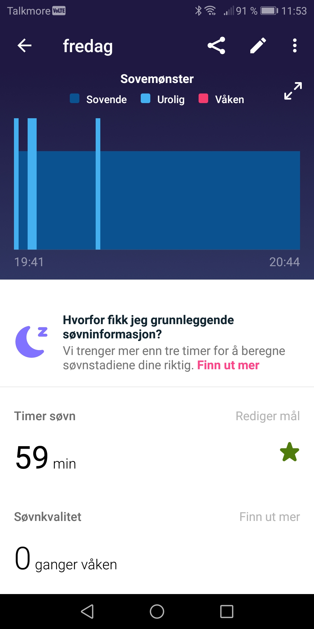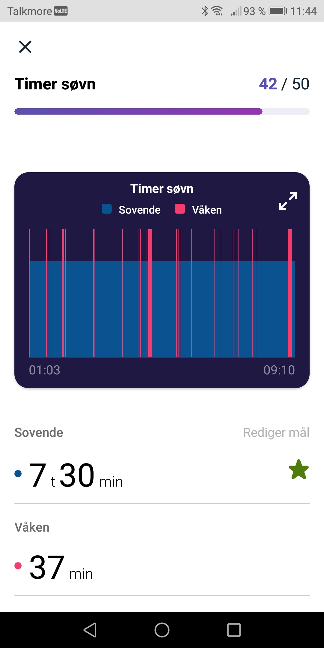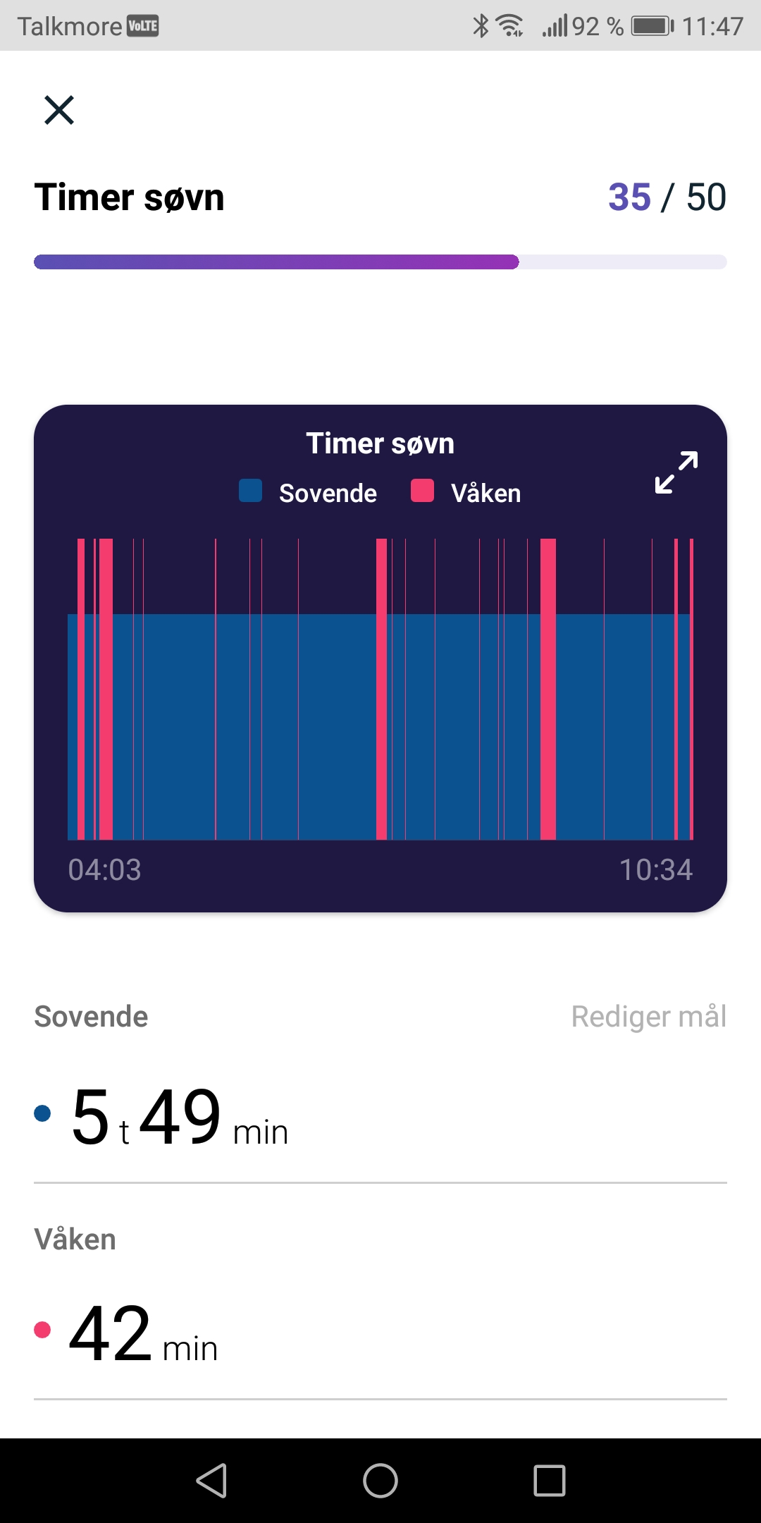 AnonymBruker Skrevet 20. august 2022 #1 Skrevet 20. august 2022 Jeg sliter med søvnen, og har de siste 20 årene aldri våknet og følt meg uthvilt. Jeg kjøpte meg nylig en fitbit, og ser at jeg har veldig mange perioder i løpet av natten der jeg er våken. Lurer på om det er flere som har samme mønster, om det er helt normalt? Jeg har så lyst til å kjenne på følelsen av å være uthvilt. Overse tidspunktene på bildene, det er ingen forskjell i hvordan jeg føler meg om jeg sover fra 01-09 eller 22-06. Av og til tar jeg en lur på sofaen og synes alltid at jeg sover best da, som grafen også viser. Anonymkode: 67853...bfc
