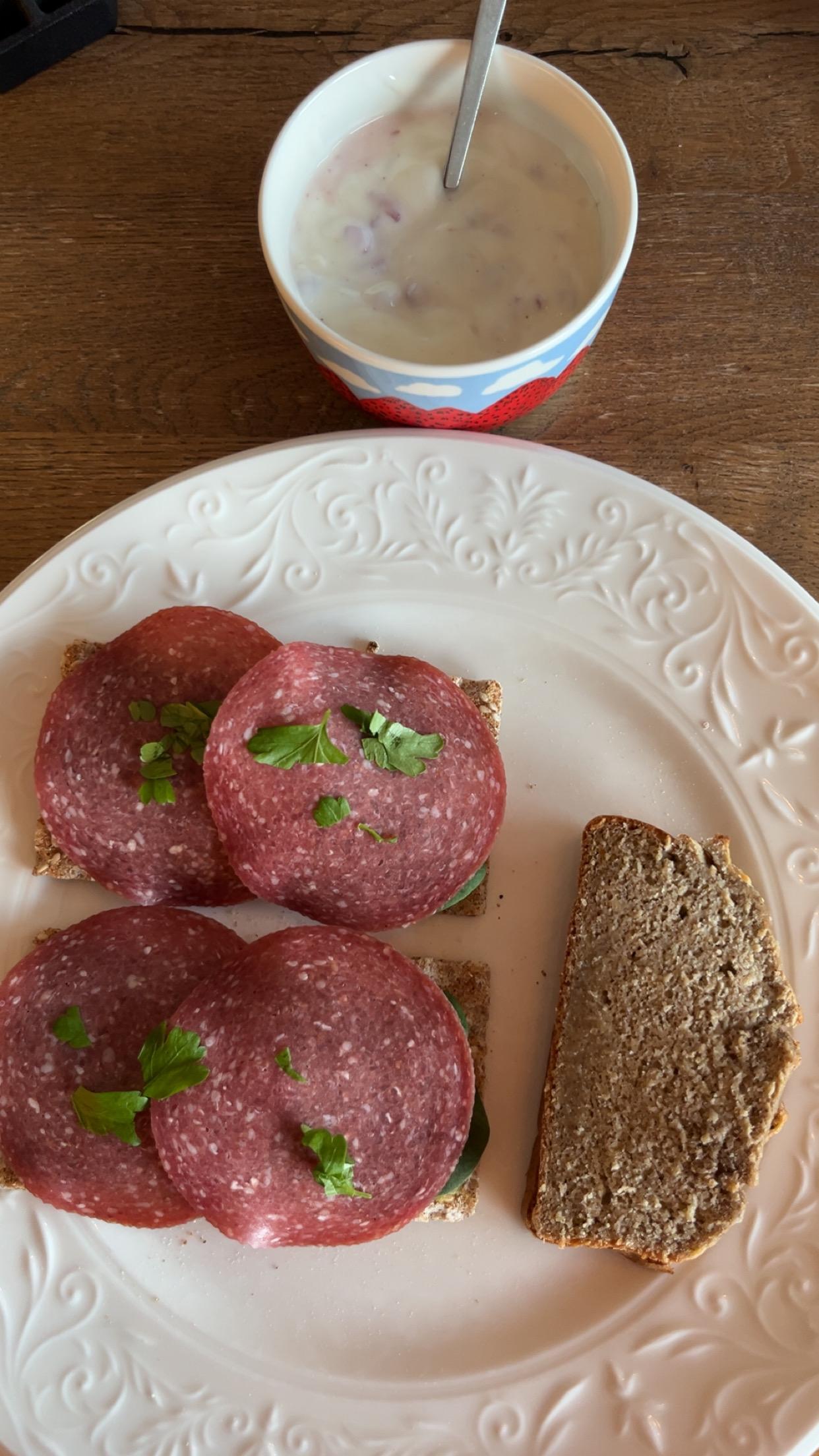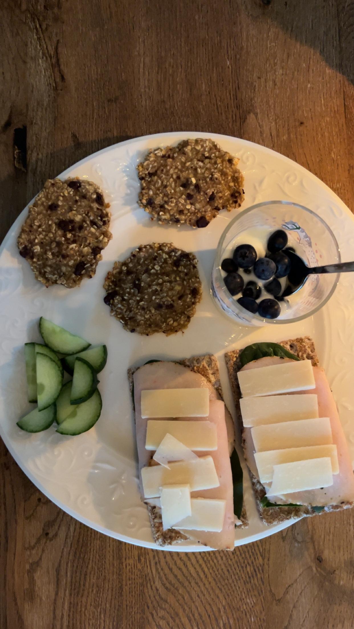 To knekkebrød med plantego’ avokado-kikertpålegg, spinat, mager salami og persillepynt. Helgrovt bananbrød. (To skiver av det, og med julebrunost mellom der). Vaniljeyoghurt der noen granateplekjerner er rørt inn🥰