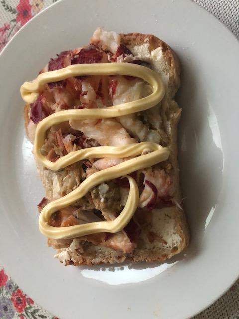 Varm, grov minibaguett med røkt kyllingpålegg og rabagast. Og litt ferskenyoghurt.