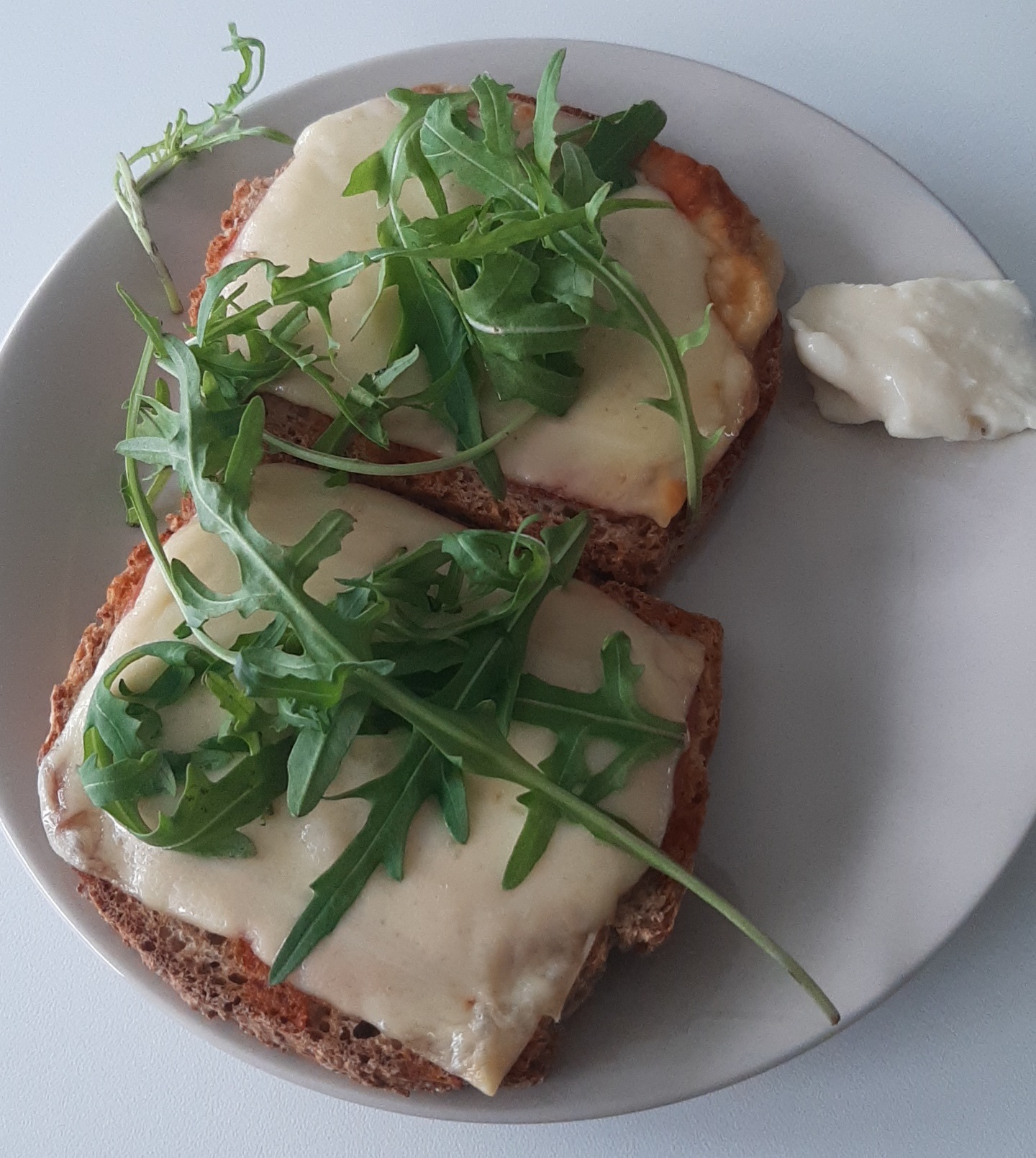 Ostesmørbrød med rød pesto, ost og skinke, aioli, ruccula.