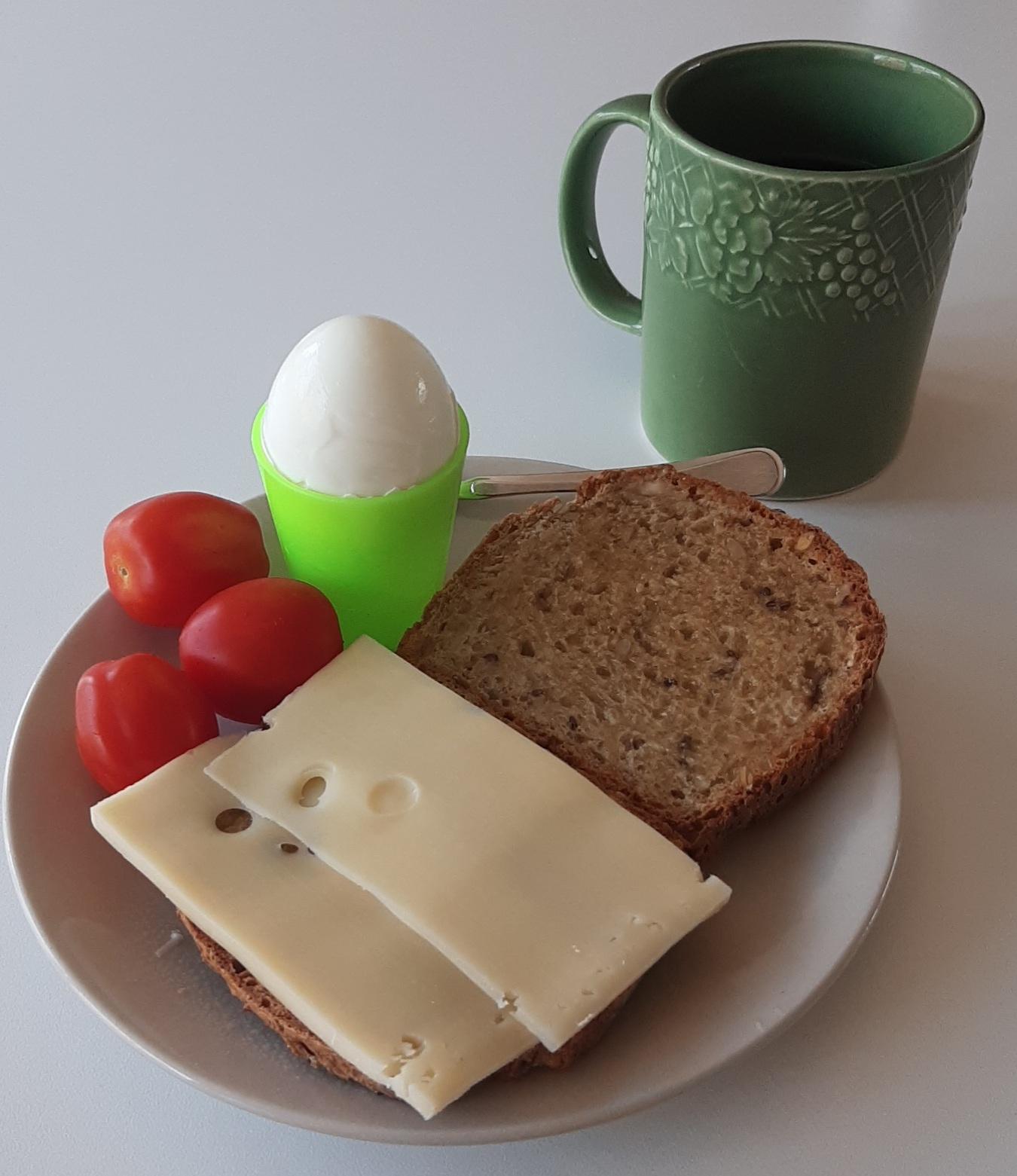 Bløtkokt egg og skive med smør til, skive med Jarlsberg, tomater og kaffe.