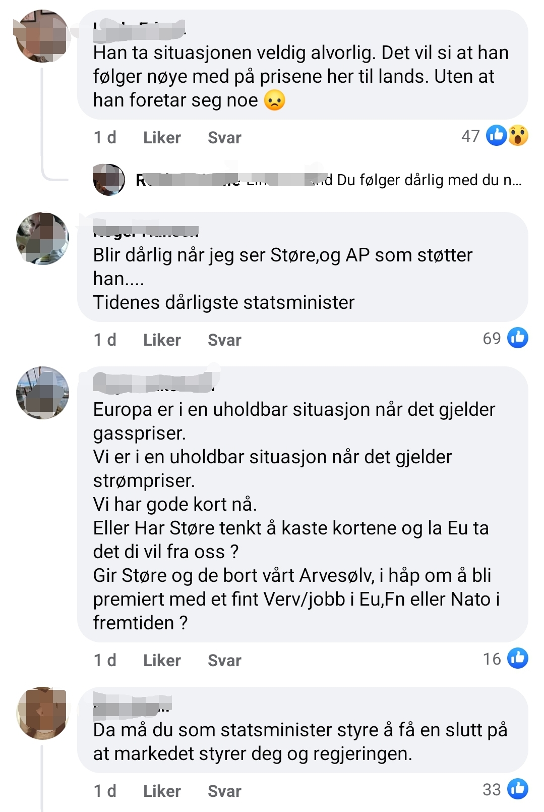 Janne R. E. Skrevet 16. september 2022 Forfatter #5 Skrevet 16. september 2022 (endret) Optimo skrev (2 timer siden): Hvilken side snakker du om? Arbeiderpartiets offisielle Facebookside er full av kommentarer som på skjermbildet nedenfor. Dette er jo heller ikke videre konstruktiv kritikk. Hvis du har fått noe slettet herfra mistenker jeg at du ikke har vært så konstruktiv som du tror. Sensur driver de tydeligvis ikke med, hvertfall. https://fb.watch/fzYPRdPDgQ/ Jeg tenkte på Jonas Gahr Støres personlige Facebook-side samt denne siden: https://www.facebook.com/groups/395254991918775 Jeg er klar over at ikke alle sidene til AP er like restriktive mot kritikk men det rettferdiggjør ikke den kyniske rosemalingen av egen virksomhet på andre sider der mesteparten av kritikk blir slettet og inleggerne utestengt. Endret 16. september 2022 av Janne R. E. 1