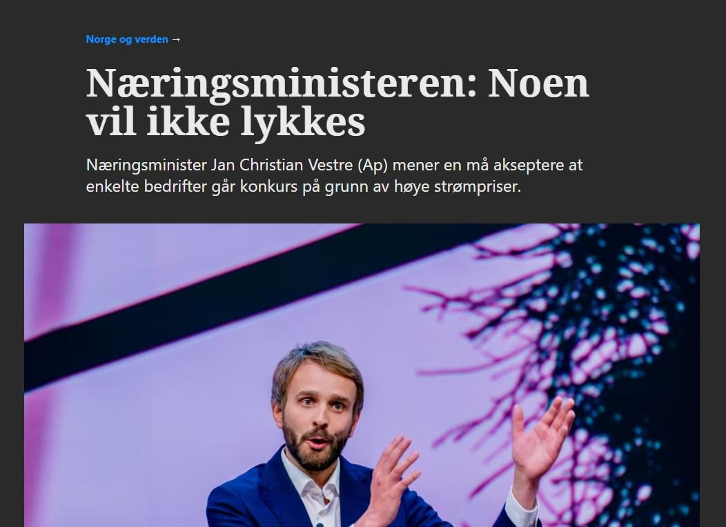 nebbete fugl Skrevet 23. oktober 2022 #1 Skrevet 23. oktober 2022 (endret) https://www.aftenposten.no/norge/i/mBKed4/nyhetsstudio-siste-nytt?pinnedEntry=62869 Dette skriver de på Facebook: Kjære Statsminister Jonas Gahr Støre og Næringsminister Jan Christian Vestre. Hadeland Glassverk har overlevd både Napoleonskrigen, 1. og 2. verdenskrig. Nå er det dere som regjering som er i ferd med å sette en stopper for 150 arbeidsplasser for solide arbeidsfolk, fordi dere ikke har handlekraft til å få orden på strømkrisen. 1 av 3 av våre smelteovner slukkes i løpet av få dager, og flere må trolig snart stenges. Årlig strømkostnad øker fra ca 2 millioner kroner til ca 40 millioner kroner om det skal fortsette slik - det går selvsagt ikke. Vi har stor ordrereserve og skulle ha eksportert våre flotte munnblåste glass og lamper til 10 nye land i år. Endret 23. oktober 2022 av nebbete fugl 5 3 2