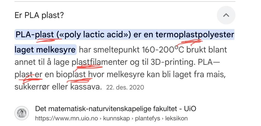 Spania33 Skrevet 8 timer siden #1825 Skrevet 8 timer siden Sharp75! skrev (1 time siden): Hvorfor så hissig? Les litt tilbake i tråden. Ha en fin dag 😘 Bare sånn at ikke andre skal falle for vranglæren din så innhentet jeg dokumentasjon fra de Naturvitenskaplige fakultet på UIO - og se; de hevder at PLA er plast de også… Det gjorde også kilden lengre bak i tråden, du hoppet nok bare bukk over ordet plast når du leste den 😘😘 1 2