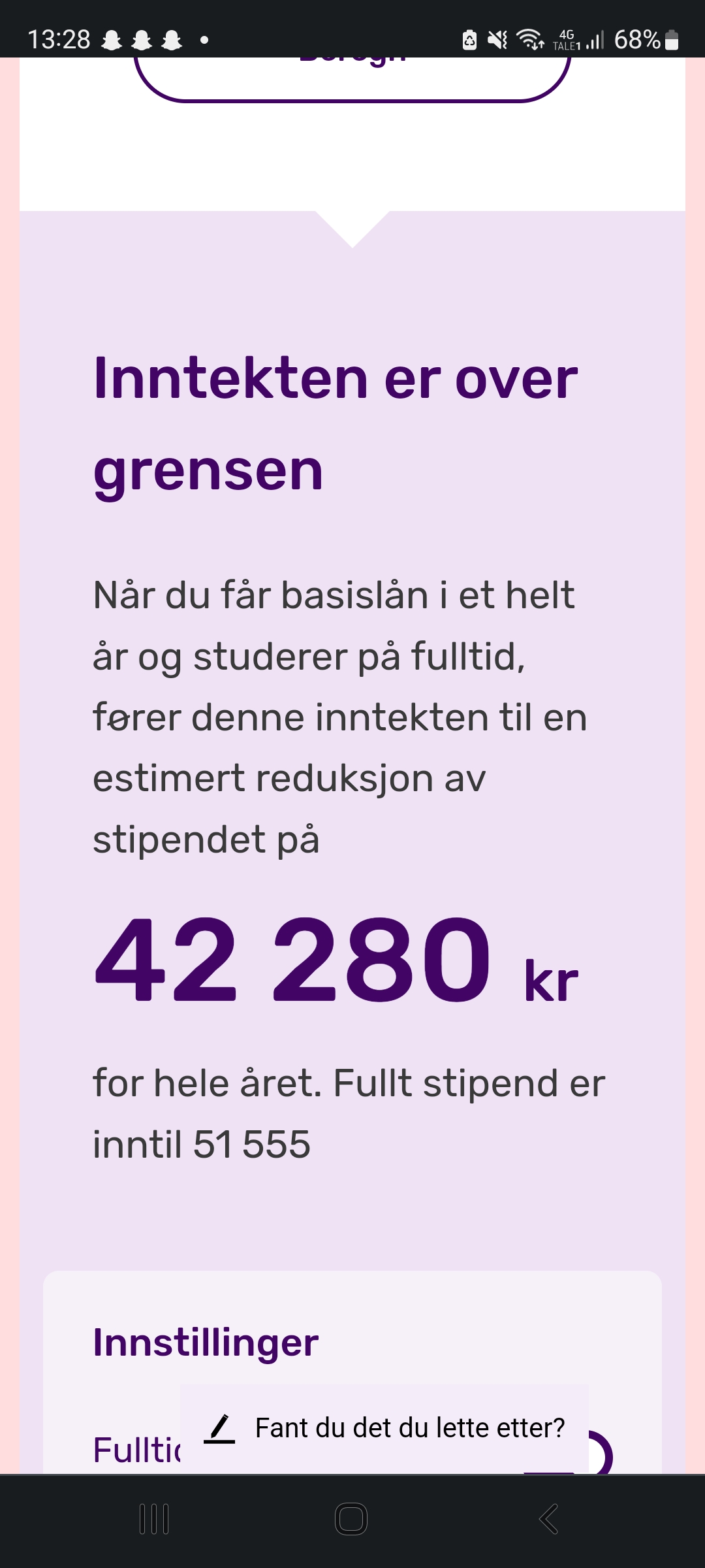 AnonymBruker Skrevet 12. november 2022 #65 Skrevet 12. november 2022 AnonymBruker skrev (27 minutter siden): Nei, det er det ikke. De følger samme regelverk mtp inntekt som alle andre. Anonymkode: ecc65...461 Ja, men inntektsgrensen for fulltidsstudium/årsstudium er igjen 106 793 kr, satsen for minsteufør er 254 168 kr-276 463 kr avhengig av om man er enslig eller ei. Enda høyere med ung ufør tillegg, barnetillegg osv. Tok for gøy kalkulatoren til lånekassen nå med satsen for enslig ufør på minstesats, og joda, kan få hele 9075 kr i støtte for et studieår, men om det blir lån eller stipend vet en ikke før de regner på det året etter.. Så igjen, på grunn av inntekten har i praksis ikke uføre rett til stipend på fulltidsstudium. På samme måte som vi i fast arbeid ikke har rett på det heller pga inntekten. Anonymkode: 5bc67...880 1
