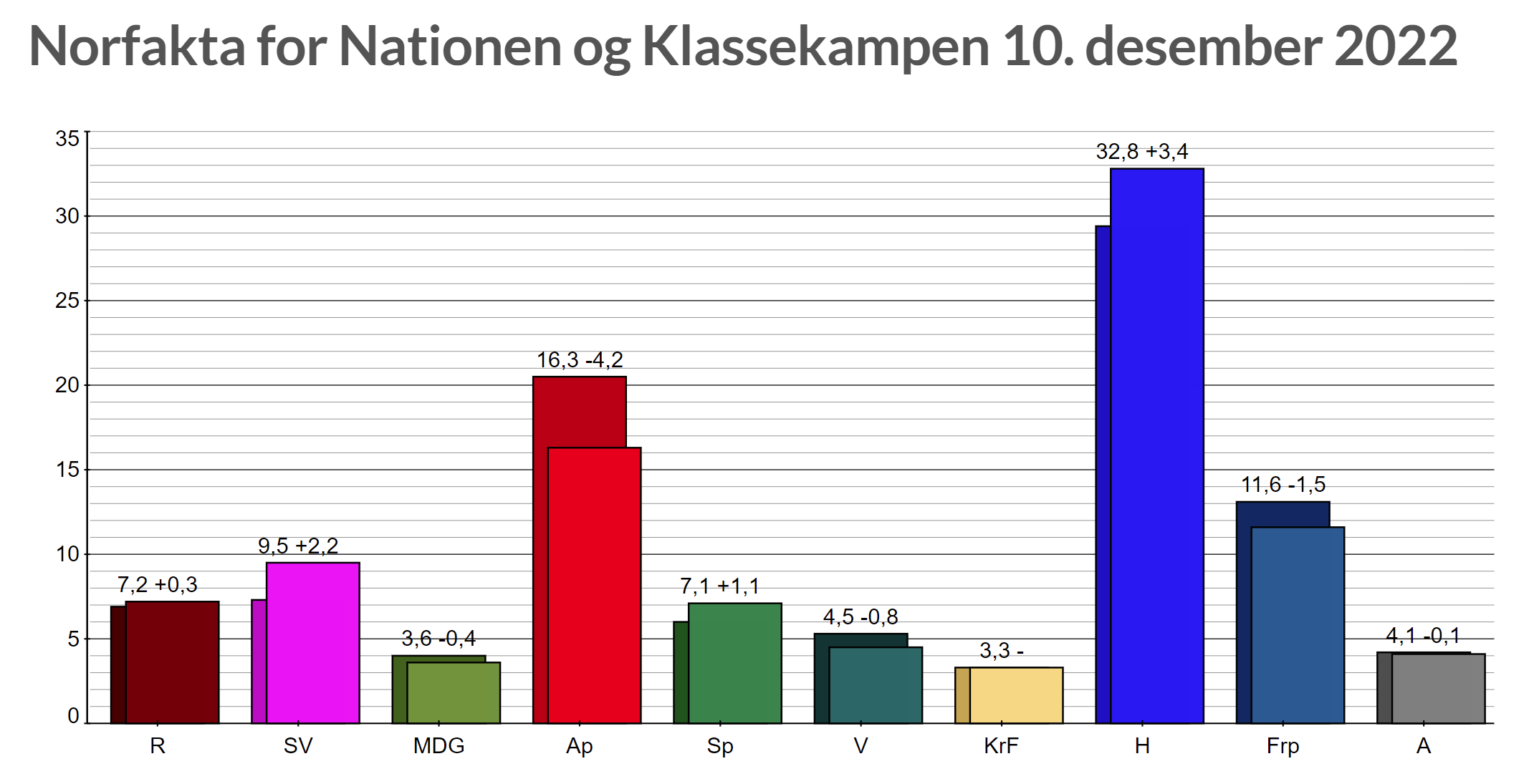 nebbete fugl Skrevet 11. desember 2022 #1 Skrevet 11. desember 2022 (endret) Dette viser Klassekampens og Nationens meningsmåling i desember. Merkelig nok går Sp frem. https://www.abcnyheter.no/nyheter/norge/2022/12/11/195889990/ap-smell-pa-nok-en-meningsmaling Endret 11. desember 2022 av nebbete fugl