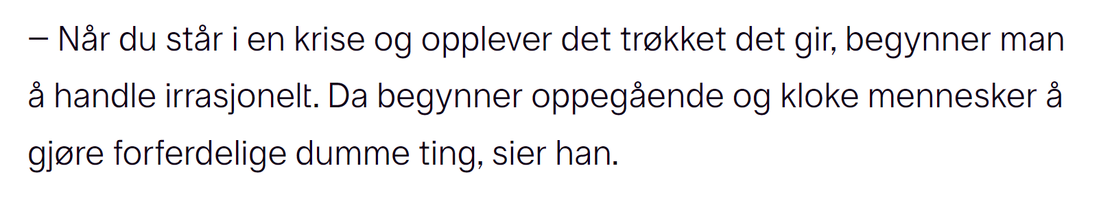 Apis Skrevet 24. juli 2023 #49 Skrevet 24. juli 2023 I Grosny skrev (10 minutter siden): Moxnes var punchdrunk, han var ikke mentalt i stand til å ivareta sine interesser. Denne videoen ødelegger en person som der og da ikke var i stand til å ta vare på seg selv. Tror det var det eneste riktige å offentliggjøre videoen fra Moxnes side, bare slik kunne han få ta eierskap på historien. Frem til han slapp videoen lå han på etterskudd og måtte hele tiden komme med historier for å komme med unnskyldninger, på de lekkasjene som dukket opp i media. Nå tenker jeg det ikke er mer å lekke, 2