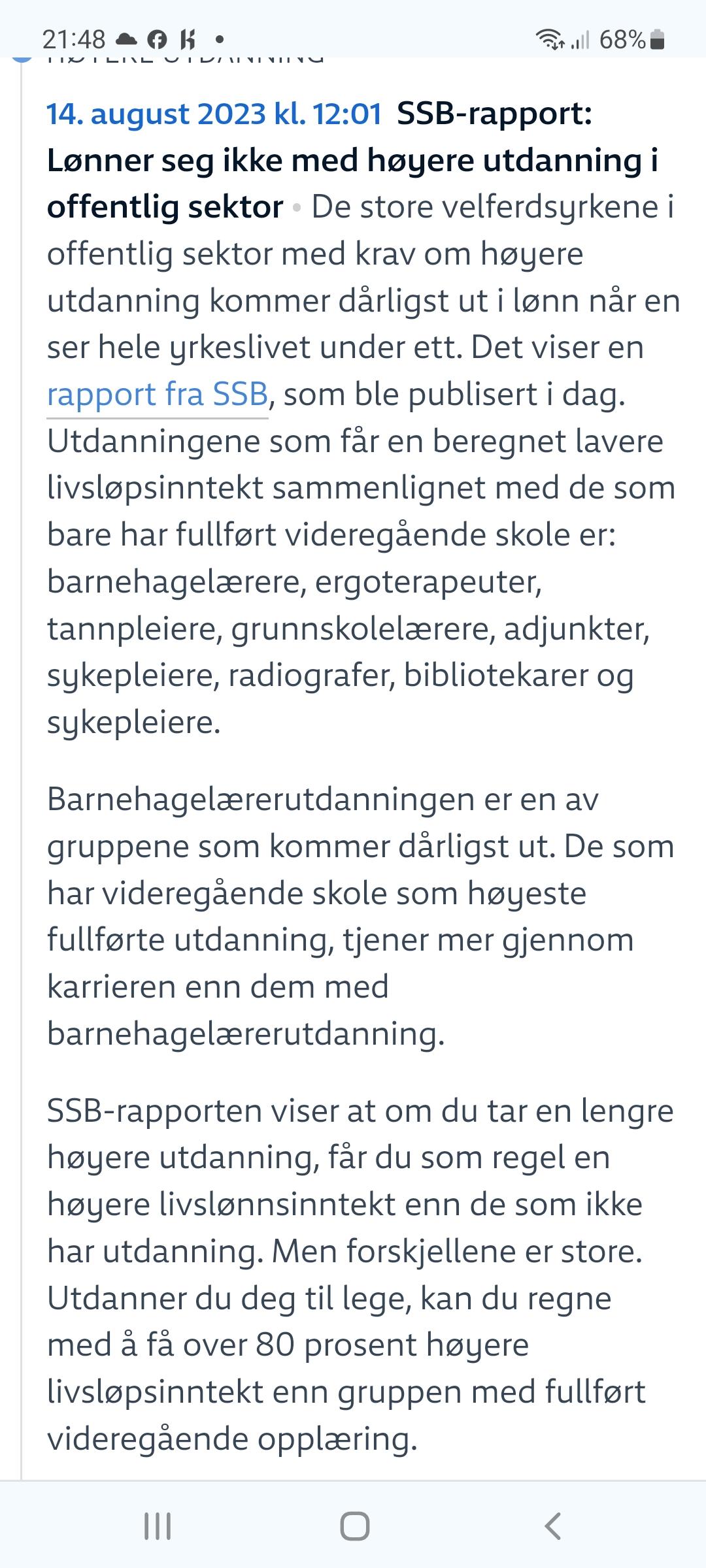 AnonymBruker Skrevet 15. november 2023 #15 Skrevet 15. november 2023 AnonymBruker skrev (45 minutter siden): Er ikke slik i Norge at utdanning er veien til god økonomi. Det har det for så vidt aldri vært. Veien til god økonomi for «folk flest» er fagutdanninger som feks håndtverkere av ulike slag. Skill på lønn og økonomi. Din økonomi handler om langt mer en lønnen. En som begynner på tømrer på vgs, vil være ferdig utdannet uten studielån, raskt ut i arbeid med tilsvarende rask inntektsbringende arbeid, raskt på boligmarkedet osv. En med feks lang universitetsutdannelse vil komme mye senere ut i inntektsbringende arbeid, studielån, mye senere inn på boligmarkedet etc. Innen den høyt utdannede akademikeren har tatt igjen tømreren økonomisk, er tømreren snart klar for å gå av med pensjon. Det er ikke og har aldri vært slik at «jo høyere utdannelse jo bedre økonomi». Anonymkode: d191e...4f8 Dette er direkte feil. Høyere utdanning lønner seg generelt sett, men det lønner seg ikke for alle. Et eksempel er meg selv. Når de andre gikk ut i læretid etter vgs så fullførte jeg 3 årig vgs, for så og jobbe i kassa på rema noen år. Jeg tjente endel bedre enn de allerede der. De fikk i hvertfall ikke noe boliglån på hverken lærlingelønn! Videre begynte jeg på universitetet, jobbet da 60-100% i noen år og trengte ikke studielån. De var ferdige fagarbeidere nå og vi tjente omlag akkurat det samme. Jeg fikk boliglån på fordi det var forventet at jeg kom til å ha en betydelig økning i lønn i årene som kom. De fikk ikke boliglån. Midt i mitt utdanningsløp fikk jeg en relevant stilling i mitt fagfelt. Jeg var nå omlag 200 000 bedre lønnet enn fagarbeidere, og når jeg var ferdig med utdanningen dro jeg videre til neste jobb. Totalt ble jeg omlag 350 000 bedre betalt på fra fagarbeideren på 3 år. Jeg fikk boliglån tidligere og kunne kjøpe meg hakket opp etter endt utdanning. Bare forskjellen i opptjeningen til pensjon i 20-30 årene er enorm alene. Jeg er nå 34 år og leder i mitt fagfelt, med 1,4 mil i lønn. De er fortsatt... fagarbeidere med 400 - 500 000 i lønn. Det ene året jeg hang etter de ut fra vgs har i aller høyeste grad vært en god investering og gitt avkastning herfra til måneden. De yrkene det trekkea frem at det ikke lønner seg for er bhglærere osv. Men på generelt grunnlag lønner det seg. Anonymkode: fb7d2...954 2 1