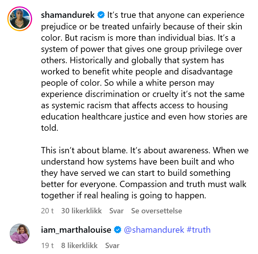 Soeuh Skrevet 5. oktober #17373 Skrevet 5. oktober Jobbermedbarn skrev (6 timer siden): Jeg har også på følelsen av at han har tatt over styringen der, trist og skremmende. Jeg føler det samme som dere. Spesielt hvordan hun svarer i kommentarfeltet på videoene om rasisme: Har observert Durek på instagram en stund, og det er typisk han å svare "truth" eller "#truth". Så enten er det han som svarer, eller så blir hun bare mer og mer lik ham. 3 3