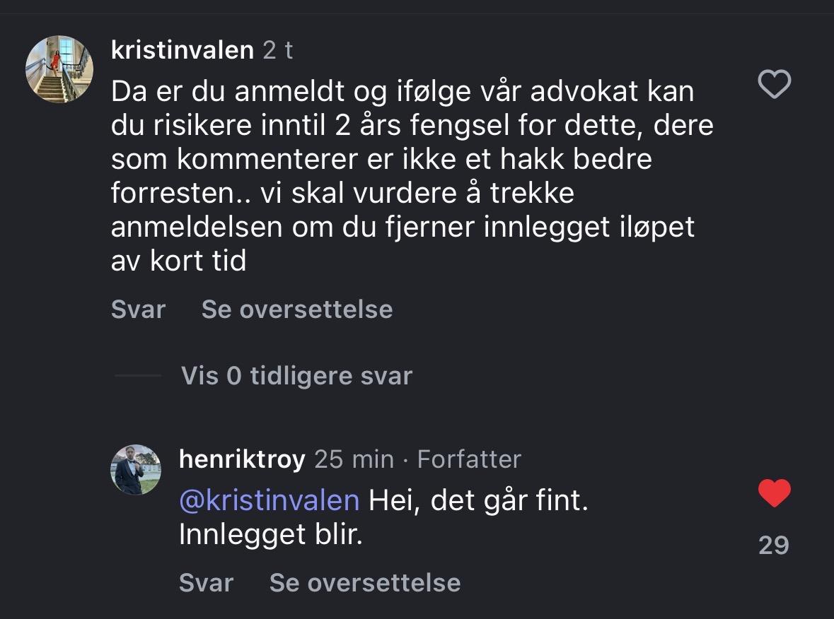 oss-to Skrevet 8. oktober 2025 #149 Skrevet 8. oktober 2025 (endret) Endå ein gong set Henrik Troy barneeksponering på dagsorden 🙌🙌🙌. Eg håpar tida endeleg er inne for å ta denne viktige debatten – om born si rett til privatliv på sosiale medium. Lat oss stå saman og støtte kampen for at born skal få vekse opp utan å bli eksponert på nett !. Endret 9. oktober 2025 av oss-to Tok vekk bildet då eg ikkje vil generere til kontoen hennar. 33
