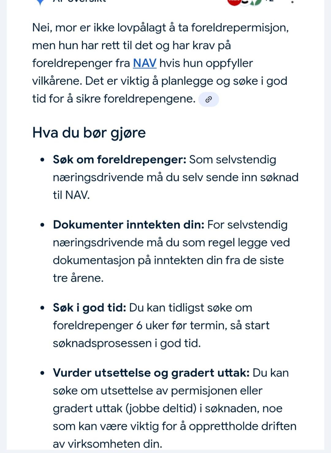 Nysådd Skrevet mandag kl. 09:10 #1227 Skrevet mandag kl. 09:10 Kjempeliten skrev (2 minutter siden): Lurer på hva som kan være gyldig grunn til å slippe å ta denne permisjonen? Skjønner at UB ikke går under den loven uansett. Men siden hun nevner det, så lurer jeg på hva begrunnelsen er? Som jeg skrev over - det er en snever unntaksregel. Av lovteksten fremgår det at det må være bedre for mor å være i jobb, og eksemplene fra teorien er at barnet ikke er levedyktig eller er adoptert bort. Altså ting som trekker i retning av at det ikke er noe barn der som skal ha tilknytning til mor senere, og at mor kanskje har godt av å få tankene over på noe annet. Jeg finner ingen rettspraksis knyttet til bestemmelsen, og det er ikke så rart i og med at det gjelder en kortvarig plikt som er av liten interesse å få en avgjørelse i retten om lang tid senere. 9 11