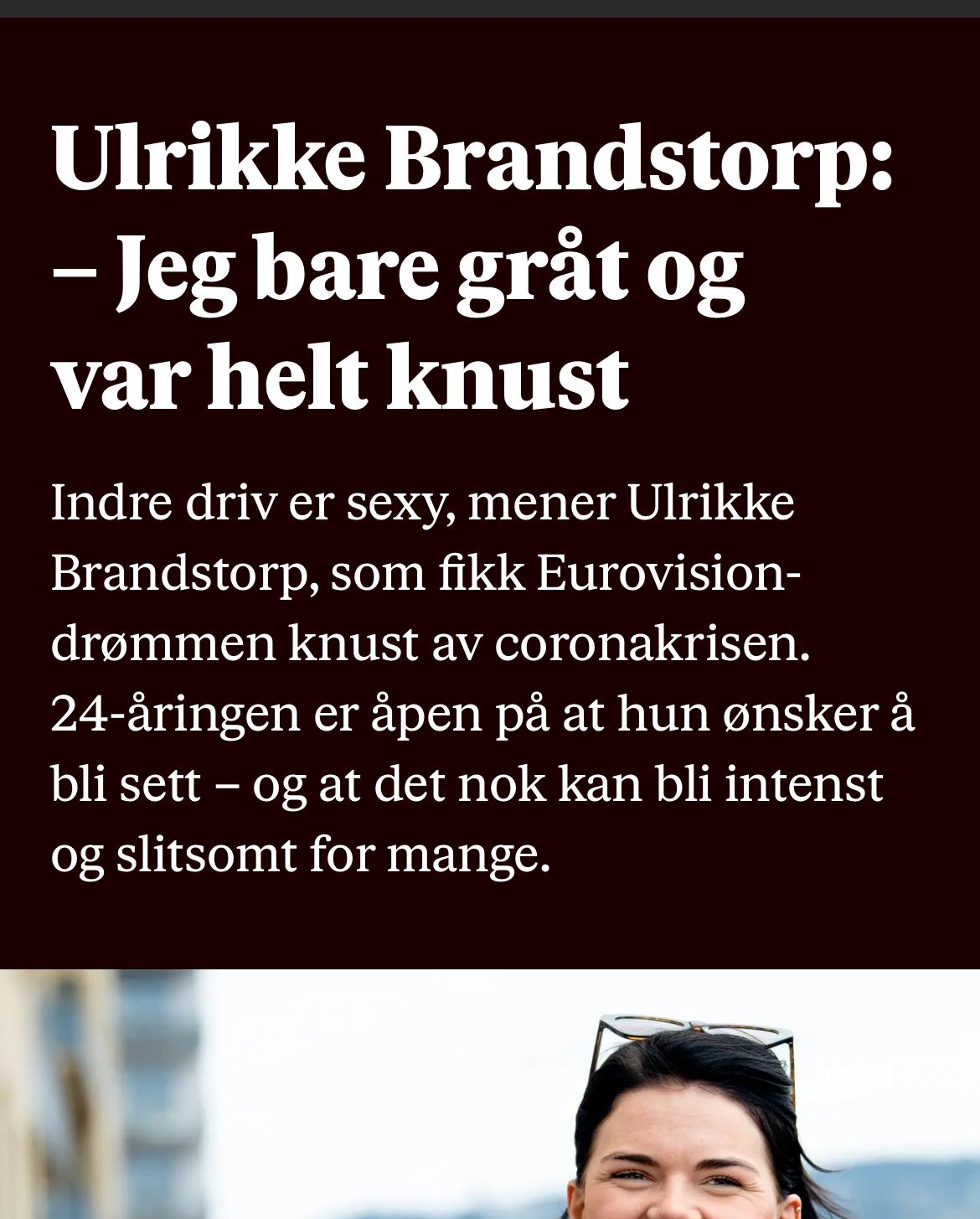 Stargaze Skrevet 15. oktober #1873 Skrevet 15. oktober https://www.vg.no/rampelys/i/op2vzK/ulrikke-brandstorp-jeg-bare-graat-og-var-helt-knust ikje første gang med hyl og skrik. For øvrig en interessant beskrivelse av seg selv: 16 6