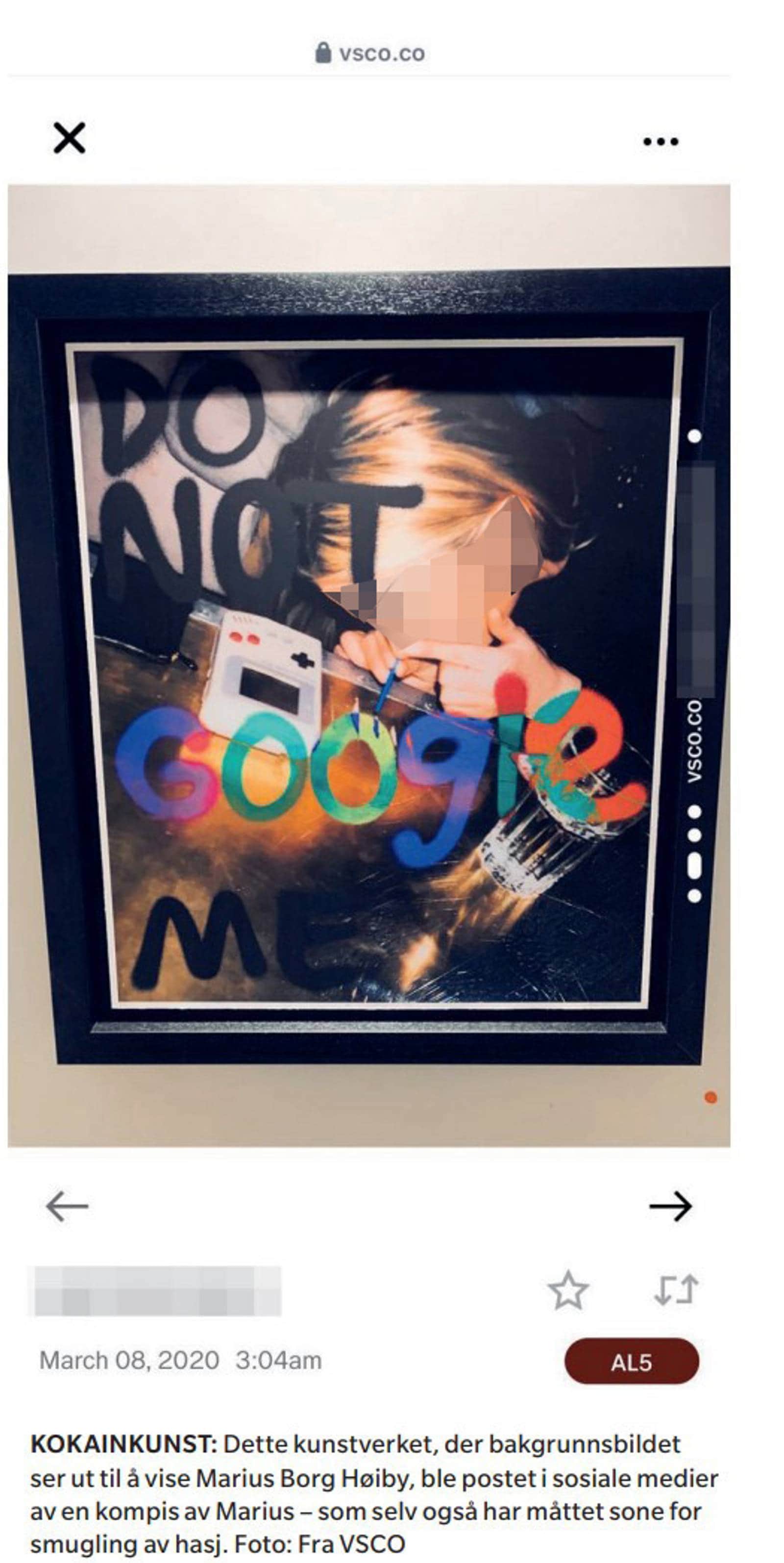 Kunstutstillinger er lov å ta bilde av. Originalbildet er henta fra intragram. Henta bildet her:  https://www.reddit.com/r/norge/s/YKn8FSqMgB   Men det har også vært postet på insta og tv.no som nevnt. Moderator: Minner om at det juridiske styret rundt bilde ikke handler om opphavsrett men at det ble hevdet å være Marius på bildet. Jeg tror ikke det er Marius og hevder heller ikke det. Ber derfor om at du lar bilde stå.