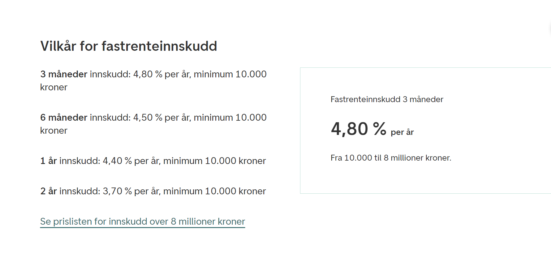 AnonymBruker Skrevet 27. november 2024 #28 Skrevet 27. november 2024 AnonymBruker skrev (2 minutter siden): Ja, men det er jo faktisk tilfelle i dagens marked. De tilbyr bedre rente for kortvarige innskudd enn langvarige. Det er bare 2-3 år siden det var omvendt. Jeg antar at det er fordi bankene heller ikke vil låse pengene over lang tid med en rente som fort kan endre seg i så stor grad som det har gjort de siste årene. Anonymkode: 0c8f2...e88 Ja, absolutt. Slik fremtidsutsiktene for norsk økonomi påvirker Lånekassens fastrenteavtaler: Når rentene er lave får man lavere rente jo kortere tid man tegner fastrenteavtale for, og når rentene er høye får man lavere rente jo lengre tid man tegner fastrenteavtale for. Fordi lengre tid tilsier at man tenderer sterkere tilbake mot en slags normal. Nå tror man at rentene skal gradvis nedover, og derfor får du høyere (års)rente jo kortere tid du binder deg for. Men TS må ha lest en tilsvarende oversikt i sin bank som at du kan få 5% rente på et halvt år eller kanskje 4,8% eller 4,9% for et helt år. Det må man jo skjønne at ikke kan stemme. Da vil det åpenbart være omtrent dobbelt så lønnsomt å binde seg 6 mnd. nå og så i 6 mnd. til etter utløpet av denne til omtrent samme rente. Anonymkode: 36e5e...1df 1
