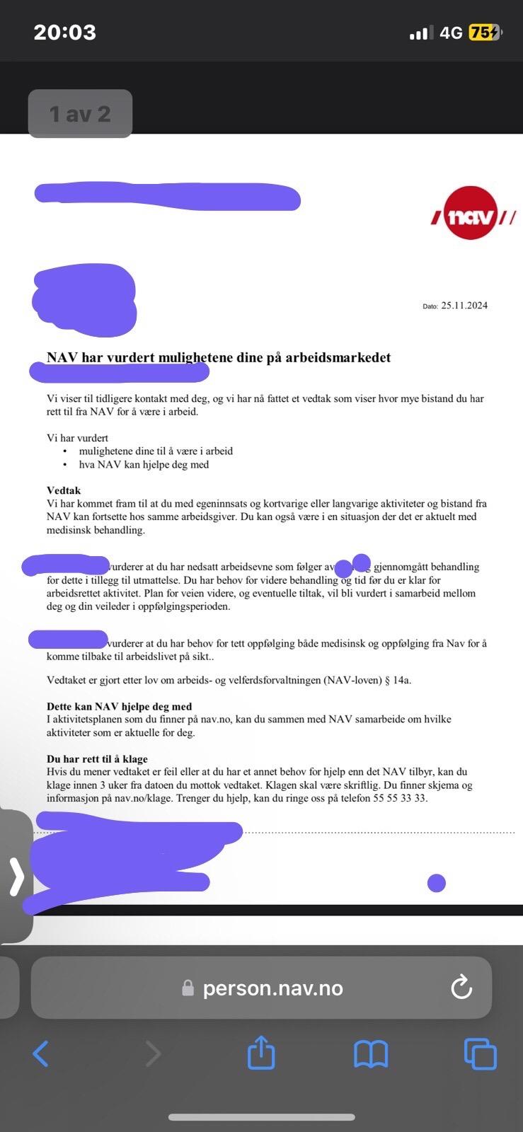 AnonymBruker Skrevet 8. desember 2024 #1 Skrevet 8. desember 2024 Etter avtale med min lege og veileder på nav så søkte jeg om AAP pga helsen min ikke er helt på plass for att begynne på jobb. fekk dette vedtak fra nav. men skjønner ju ikke om dette er svar på AAP eller om det er litt sånn standard ( brev )vurdering fra nav. noen som kan hjelpe meg og tolke det?? TAKK Anonymkode: 99961...508