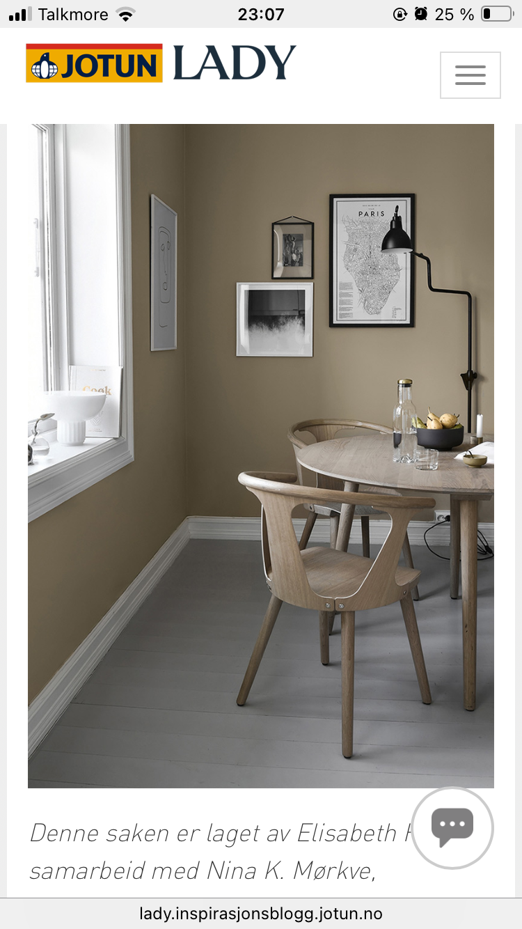 AnonymBruker Skrevet 26. september #14 Skrevet 26. september Tenkte på da grå gulvet, og kanskje en denne fargen passer inn med bæde grått gulv og grått kjøkken? Fargen er Rw Canvas, og min erfaring er at den er mer brunlig enn bildet tilsier (men det er mye som kan påvirke dette). Anonymkode: 7a216...c31