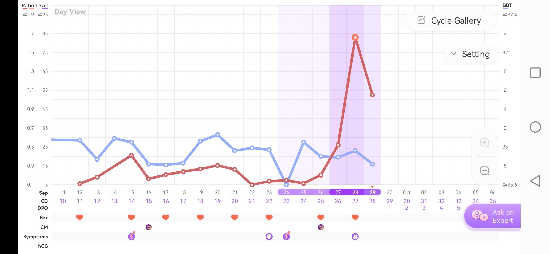 Hjulvisp Skrevet mandag kl. 18:35 #3 Skrevet mandag kl. 18:35 Ser veldig vanlig ut tenker jeg. Jeg stopper også testingen når jeg har fått en negativ test etter positivt, for man kan uansett ikke lese noe av testene etter den har vært positiv. Alt eggløsningstestene kan fortelle er om Lh-nivået øker. Og det øker bare når kroppen forbereder seg på eggløsning. Så testingen din indikerer at kroppen din prøver å slippe et egg 👌👌 Det eneste interessante ved eggløsningstester er om den er positiv eller negativ, ikke om den gir 0,15 eller 0,23 i ratio i appen 😊 Her ser du grafen min denne måneden - jeg fikk negativ el-test i dag etter flere positive tester i går, så nå gir jeg meg på eggløsningstester. Den blå grafen er BBT, altså temperaturen min. Så det er nå den kommer på banen - hvis temperaturen øker og holder seg forhøyet i minst tre dager er det et tydelig tegn på at eggløsning har skjedd. Lykke til denne syklusen 🤞🏽 1