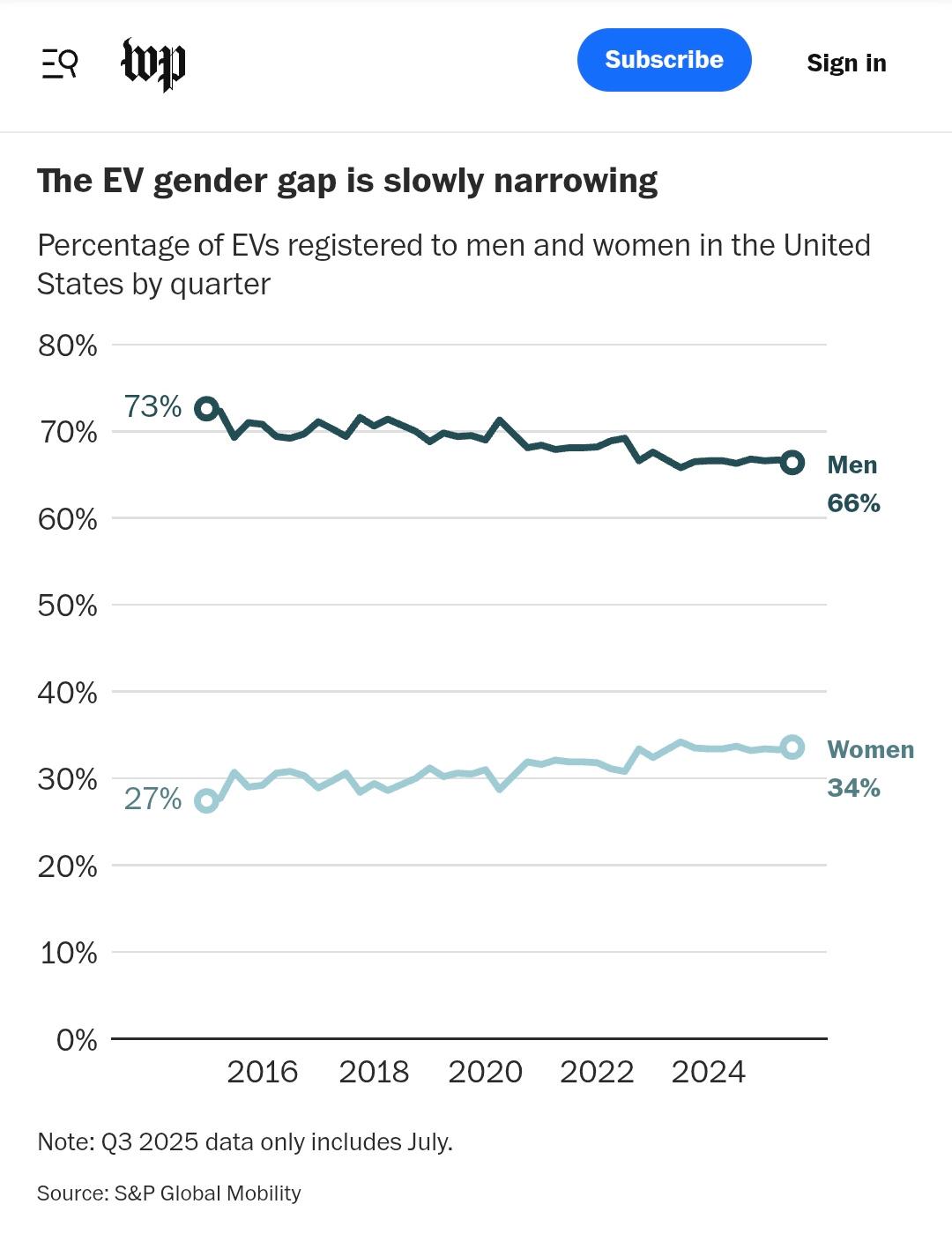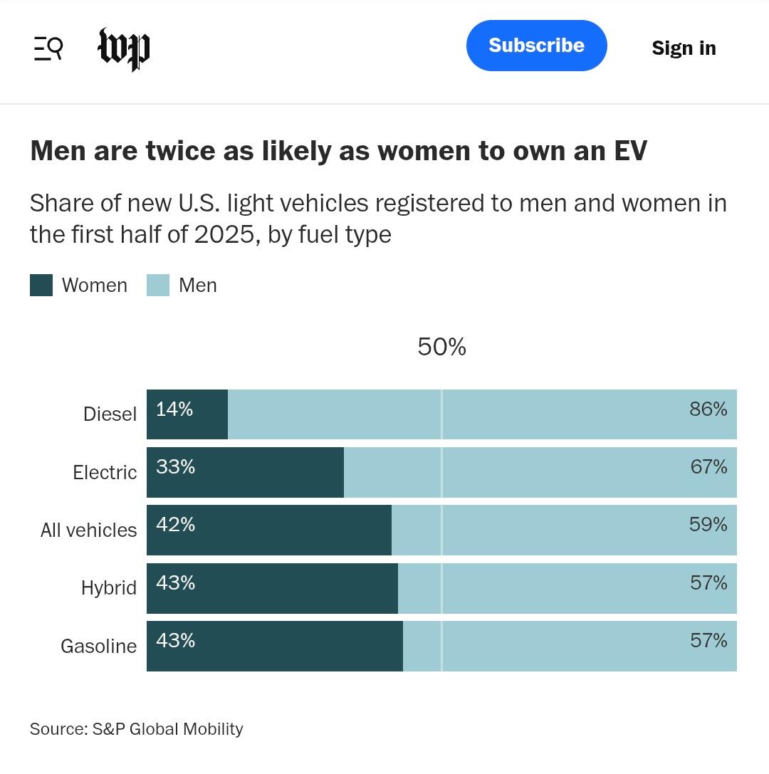 AnonymBruker Skrevet 23 timer siden #1 Skrevet 23 timer siden Artig artikkel i WP: https://www.washingtonpost.com/climate-solutions/2025/10/14/ev-gender-gap-women/ Hvordan er dette i Norge, tro? Er vi mer likestilte, som vi skulle tro og forvente? Regner med at den relativt høyere andelen diesel for menn er lik her på berget. Anonymkode: df4e9...13b