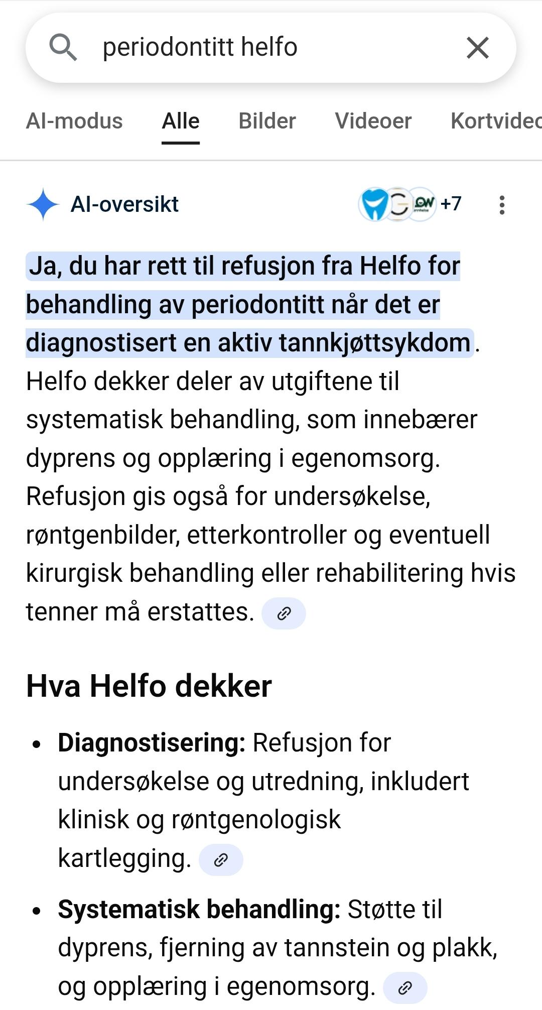 AnonymBruker Skrevet 5 timer siden #91 Skrevet 5 timer siden AnonymBruker skrev (5 timer siden): Periodontitt går vel på egenandel hos Helfo og frikort etter hvert. Anonymkode: 61bee...3b5 Ikke frikort på det nei. Moren min må ut med store summer hvert år, fordi hun ofte må inn og rense for ikke å få større lommer. Hun har i alle år vært ekstrem med tannpuss, 3 ganger daglig, bruker tanntråd og munnskyll, allikevel sliter hun med dette. Anonymkode: b45b6...675