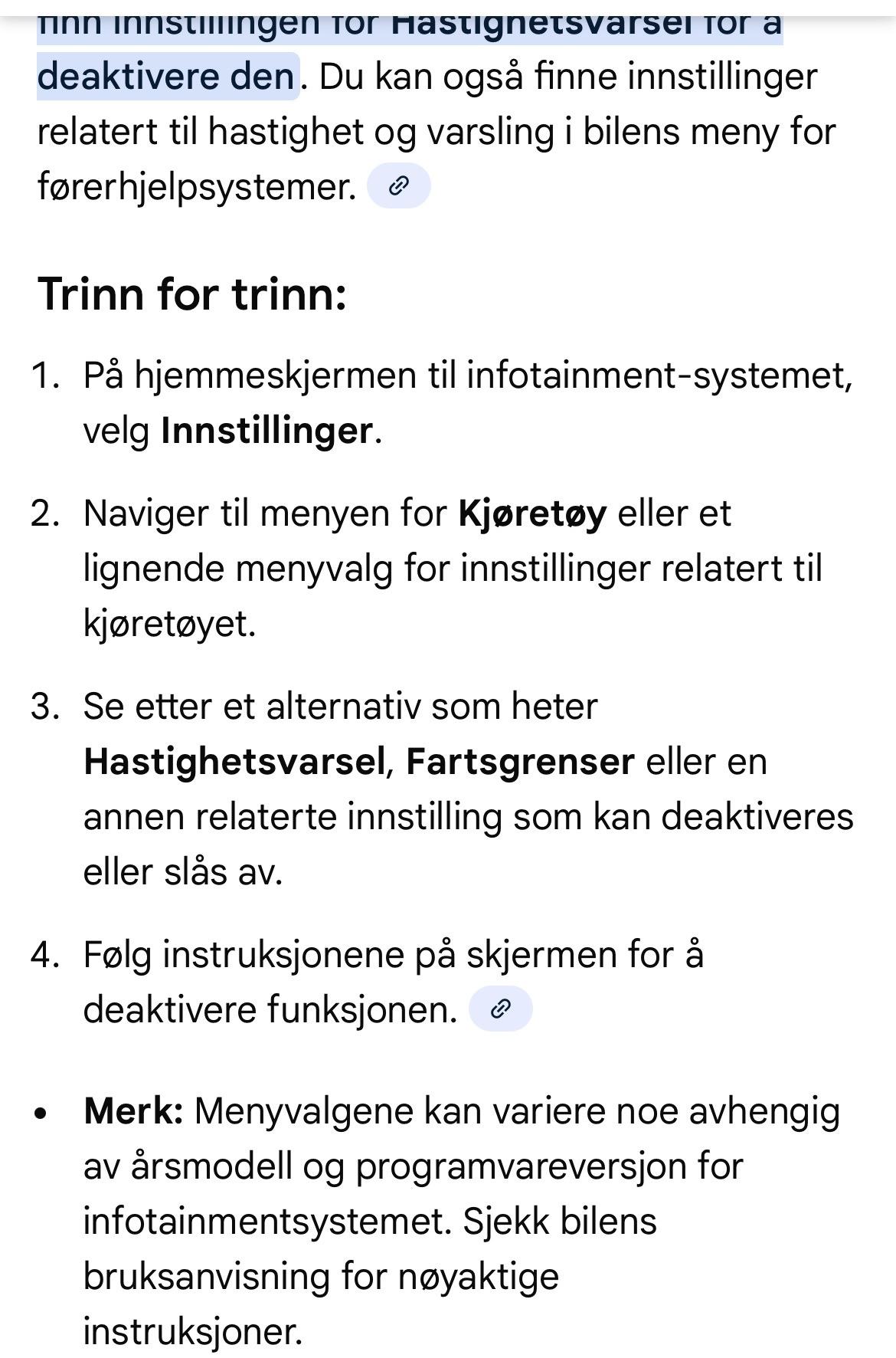 AnonymBruker Skrevet 29. november 2025 #6 Skrevet 29. november 2025 Serina.i skrev (19 timer siden): Hjeeelp hahaha blir gal! Har nettop fått en helt ny Mazda mx30 2025 model, og den plinger hver eeeeneste gang en kjører 1km!! over fartsgrensen. Den registrerer fartsgrensen, og med en gang du kjører litt over så «pulserer» fartskiltet og bilen plinger to ganger. Jeg følger alltid fartsgrenser, men blir som regel at det er noen få km over av og til. Har gått inn på alt av sikkerhets innstillinger for fart, men ingenting hjelper. Skal selvfølgelig ta kontakt med verkstedet mandag, men tenkte høre om noen her har noe som helst peiling slik jeg ikke går stuck med den plinge lyden penetrert inn i skallen hele helga😂 Enkelt er det ikke, men her er en måte å finne det på. Det stiller seg forøvrig tilbake igjen når du starter ny kjøretur. Kan være at du kan legge til en snarvei på infotainment for raskt slå det av. Vet at Skoda kan gjøre det på sine biler. Anonymkode: 6fc66...066 1