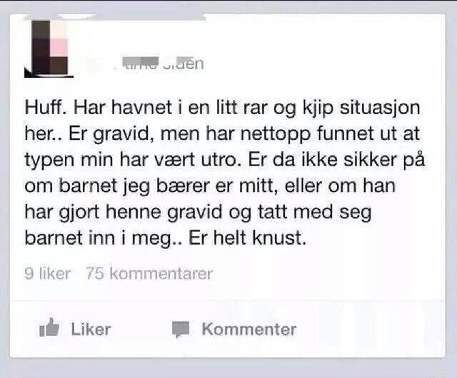 Gjest Evel Skrevet 21. mai 2014 #11 Skrevet 21. mai 2014 "Han sa han datt inni meg, og så datt han inni sin kone og nå venter vi tvillinger.." 1