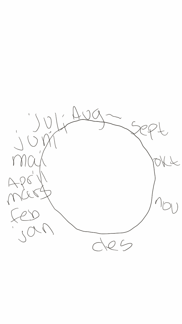 AnonymBruker Skrevet 8. juni 2014 #3 Skrevet 8. juni 2014 Jeg ser det omvendt av tegningen også.. som en klokke som går feil vei. Nyttår er på toppen.. januar er februar er det streken mellom sommer og høst er på TS sitt bilde. Sommer der vinter er osv. Timene på en klokke er månedene, men den er speilvendt, så 1 (januar) er på venstre side av klokka 12 (som er nyttår). Plassen mellom klokkeslettene er måneder. I tillegg ser jeg denne "klokka" ovenfra, som om jeg står ved nyttår og ser ned på den på skrå. Anonymous poster hash: d44b3...2bb 6