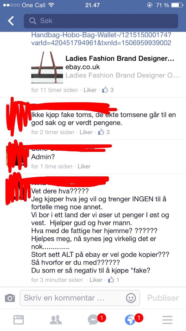 AnonymBruker Skrevet 22. august 2015 #1065 Skrevet 22. august 2015 Hun som ville kjøpe fake Toms har lagt ut følgende etter noen sa hun burde kjøpe ekte : Vet dere hva????? Jeg kjøper hva jeg vil og trenger INGEN til å fortelle meg noe annet. Vi bor i ett land der vi øser ut penger I øst og vest. Hjelper gud og hver mann. Hva med de fattige her hjemme? ?????? Hjelpes meg, nå synes jeg virkelig det er nok.............. Stort sett ALT på ebay er vel gode kopier??? Så hvorfor er du med?????? Du som er så negativ til å kjøpe "fake? LolAnonymous poster hash: 4e264...17f 4