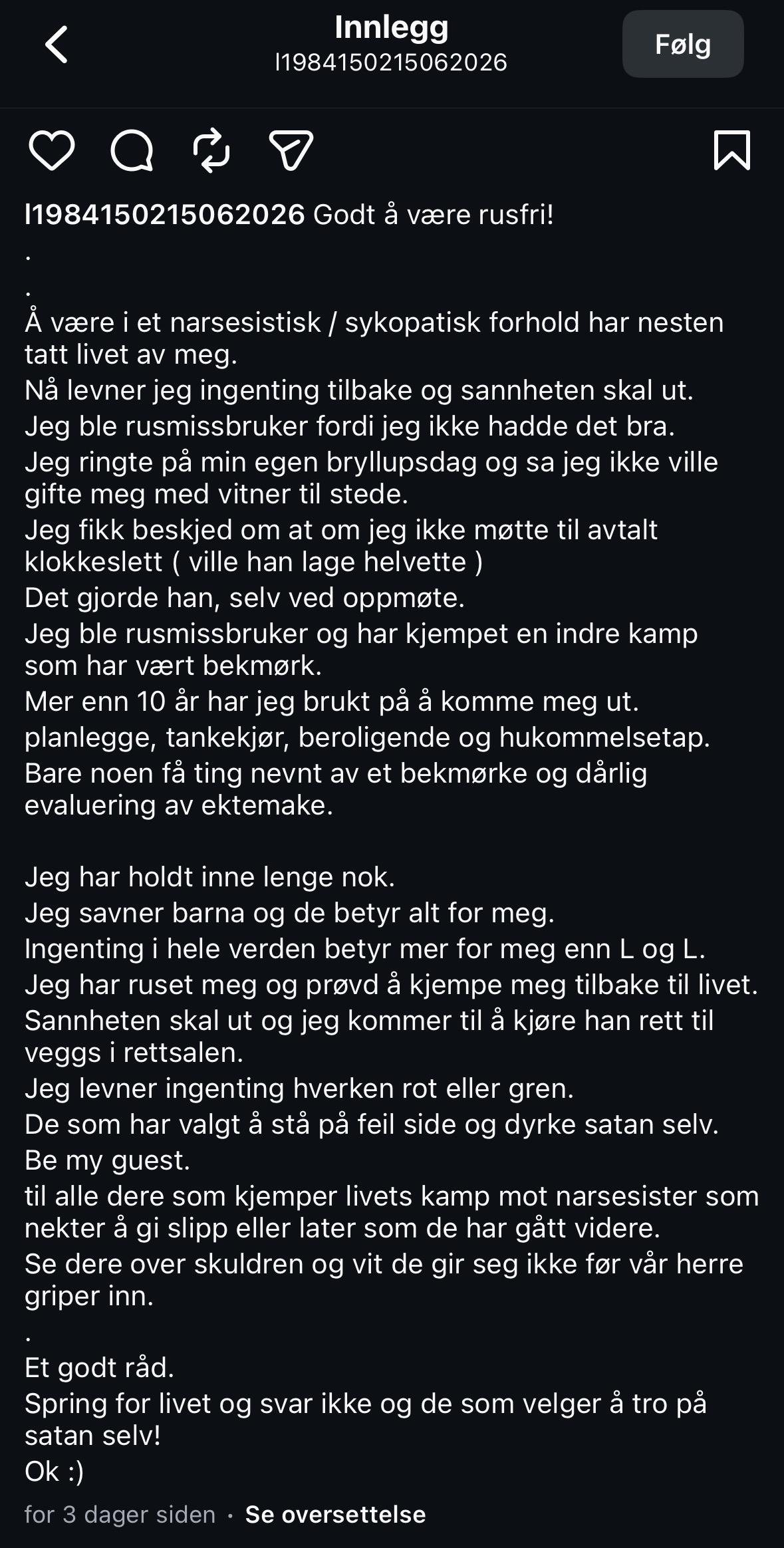 hso Skrevet 9 timer siden #627 Skrevet 9 timer siden Men om man ser storyen til Lise, å hva hun skriver der. Så er nok delen med at hun ruser seg sant. Om han er det ene eller det andre vil jeg ikke mene noe om, for jeg kjenner de ikke. Men jeg kan mye om rus og rusomsorg. Å det er veldig vanlig at de som ruser seg legger skyld over på andre, å ikke kan tas som troverdige i en ruset situasjon. Når det er sagt er ikke det det samme som at det ikke kan være sant. Men hadde det komt fra en som hadde vært rusfri over lengre tid, hadde det vært mer troverdig. Uansett så er situasjonen veldig trist, lise var veldig flink med interiør og hadde en veldig inspirerende konto, og hun er nok uendelig glad i barna sine. Så er jo bare å håpe at hun kommer seg ut av dette og finner tilbake til seg selv igjen! 2
